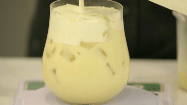 Yellow drink with cream on table