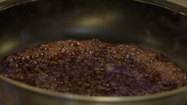 Meat sizzling in a pan with sauce