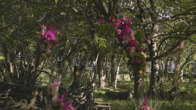 Tree decorated with colorful flowers in forest