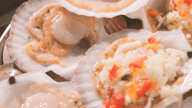 Fresh scallops and clams grilled with seasoning