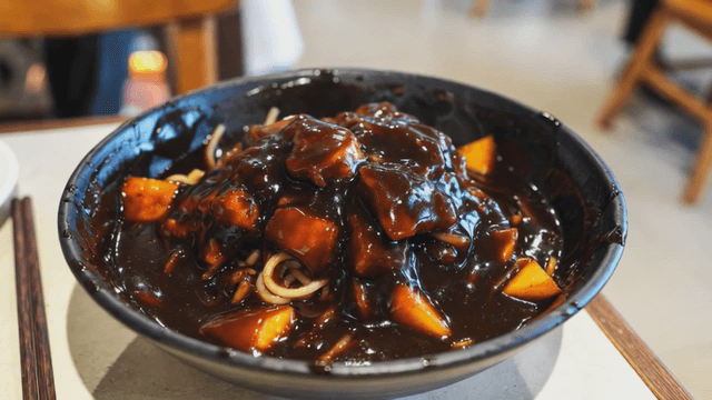 One bowl of rich Noodles in Black Bean Sauce on a table