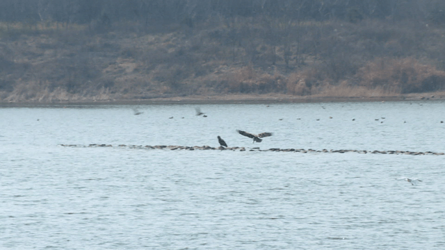Birds resting in a enclosure surrounded by rocks with a small pond