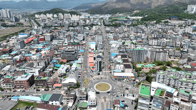 Panoramic view of a coastal city surrounded by green mountains under a cloudy sky