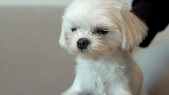 Small curly-haired poodle dog standing on an outdoor concrete floor