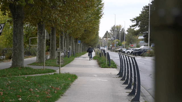 Bicycle parked on a tree-lined sidewalk on an autumn day