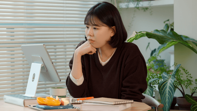 Woman studying on tablet at her desk