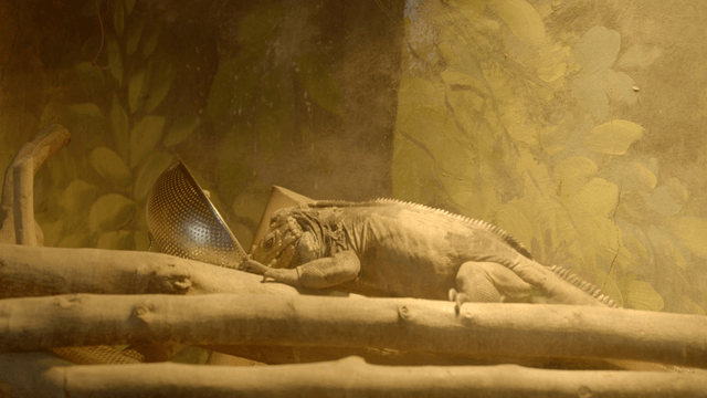 Two vibrant parrots perched on a tree branch in a lush, simulated tropical environment