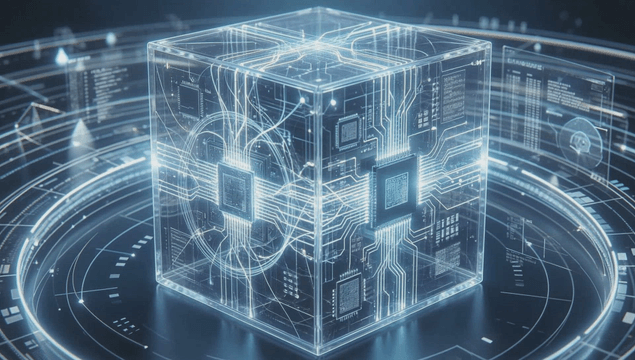 Futuristic Rotating Holographic Cube Displaying Data
