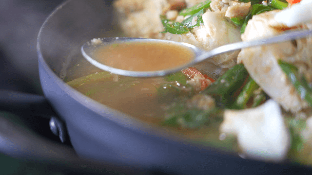 Spoon scooping clear broth from phellinus linteus ginseng chicken soup
