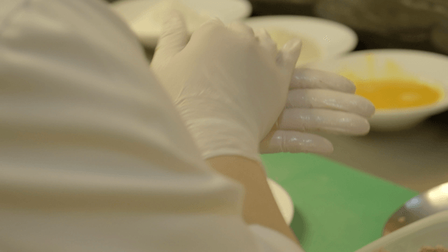 Chef preparing food in a bowl with soy sause with wild chive in the kitchen