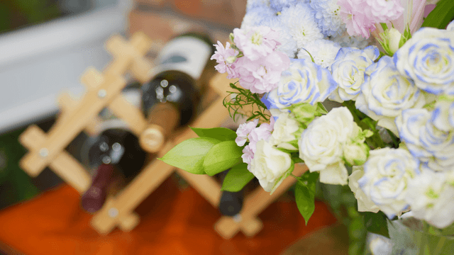 Pouring white wine into a glass on a cozy dinner table with lanterns