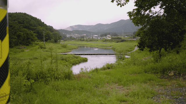 Scenic view of a serene countryside with a crescent-shaped bridge spanning over a peaceful river