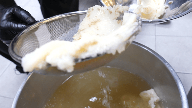 Scene in kitchen where seasoning liquid is poured into large pot.