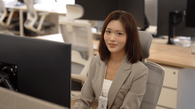Female office worker smiling while looking at office computer monitor