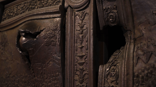 Intricate carvings on a large bronze door