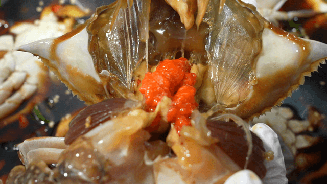 Hands squeezing out meat and intestines of soy sauce marinated crab