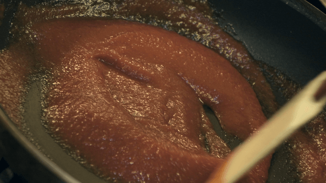 Tomato sauce being stirred in a pot