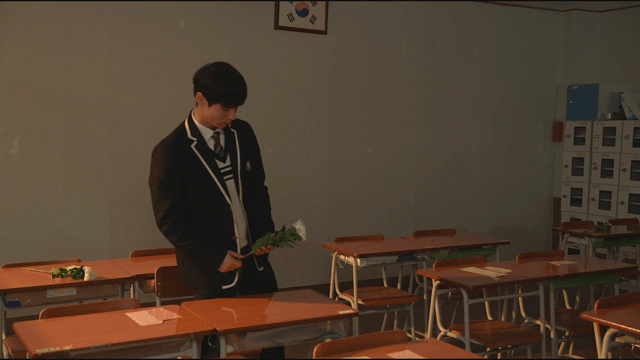 Male student's back view as he looks at chalkboard filled with memorial messages.