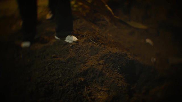Person Digging Ground Beneath a Stone Wall at Night with Shovel