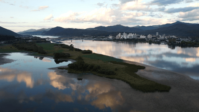 Scenic river with mountains and bridges