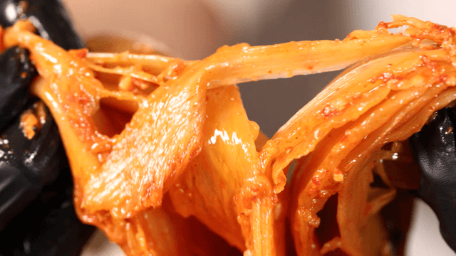Piece of aged kimchi torn apart and eaten with gloved hands