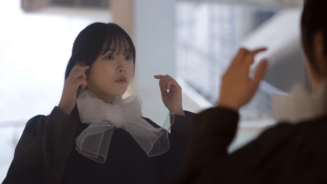 Woman adjusting hair in front of a mirror