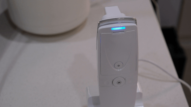 DVD player display with the "Play" button highlighted in a dimly lit room.