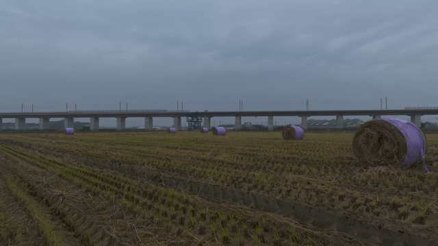 Hay bales in a field near a bridge