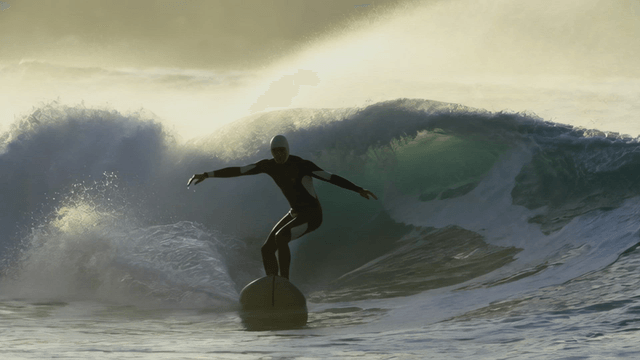 Surfer riding waves at sunset