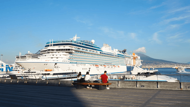 Panoramic view of a coastal city with a huge cruise ship anchored
