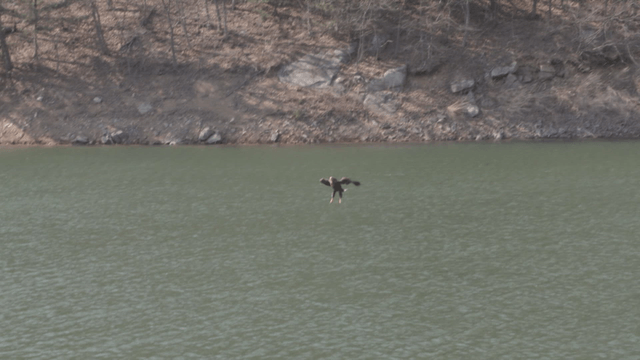 Eagle hunting prey over water