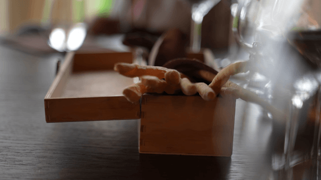 Camping of a filled wine glass with snacks around the table next to a warm fire