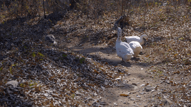 Ducks walking on dirt road