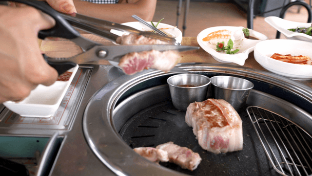 Grilled pork belly being cut with scissors