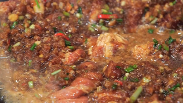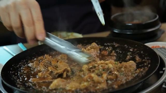 Making royal tteokbokki with meat and vegetables in a frying pan with a wooden spatula