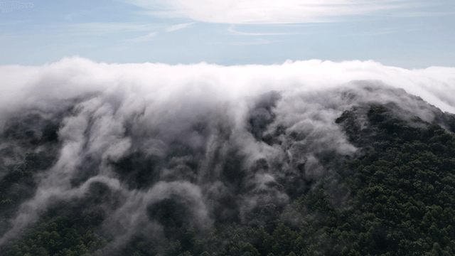 Clouds rolling over a forested mountain