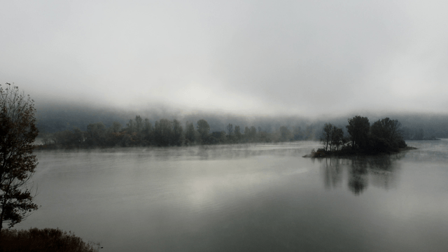 Trees on a riverbank with foggy surroundings