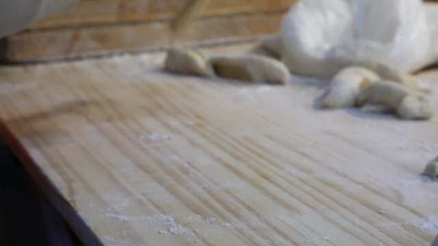Worker preparing dough pastries filled with red bean paste in a kitchen