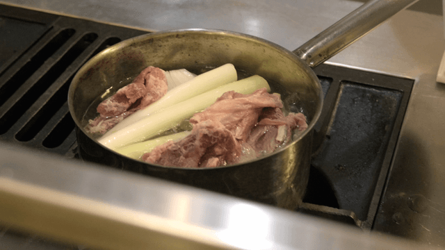 Pot of simmering meat stock with assorted vegetables