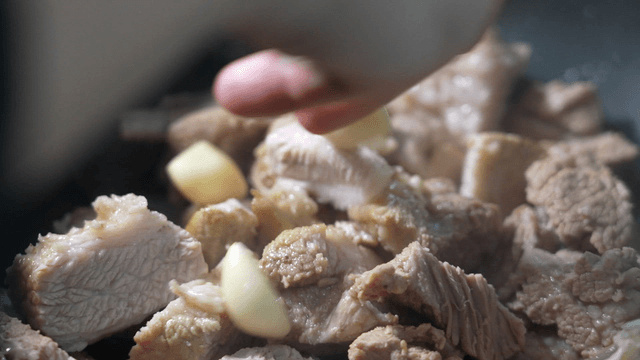 Meat and garlic boiling in a pot