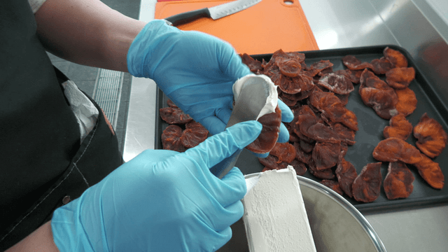 Cream cheese being spread on dried persimmons