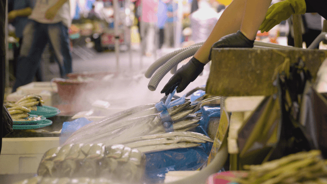 Wooden box containing ice and sea eels