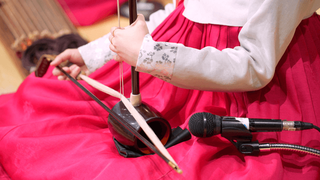 Woman playing gayageum wearing hanbok