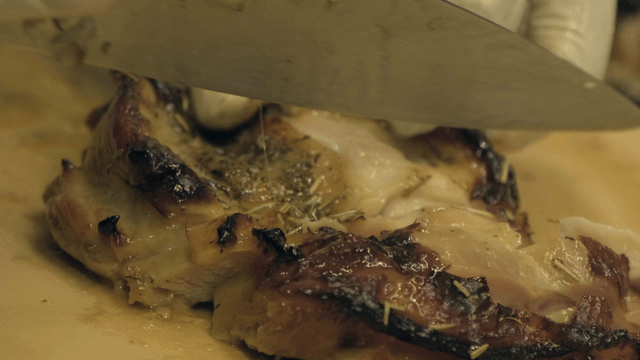 Slicing roasted meat on a cutting board