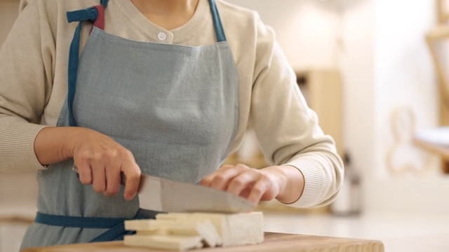 Cutting tofu on a wooden board