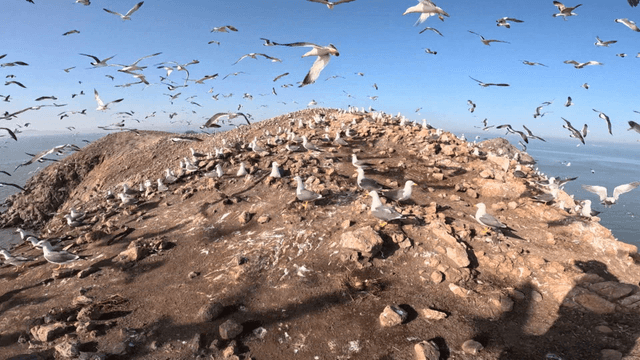 Seagulls flying over the sandy shoreline with a breakwater in sight