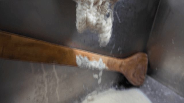 Stirring bean water in a container with a paddle
