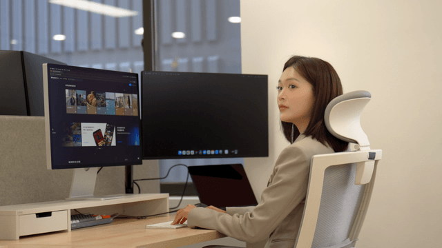 Office worker woman sitting at desk with dual monitors