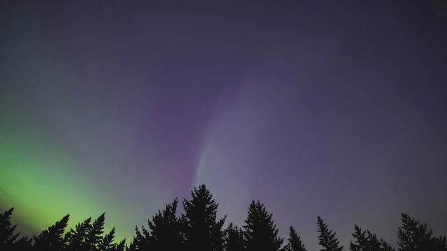 Aurora glowing in the night sky above the trees in a quiet forest