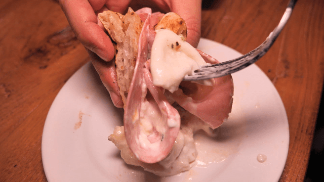 Burger dipped in cream sauce with a fork
